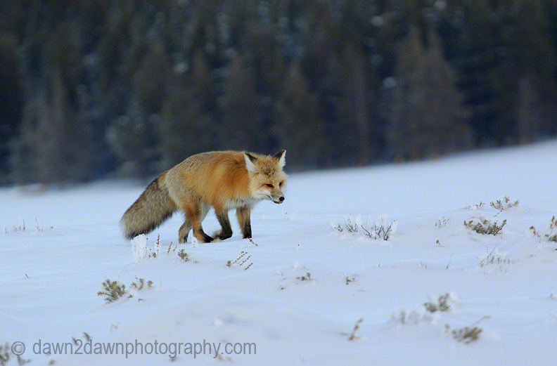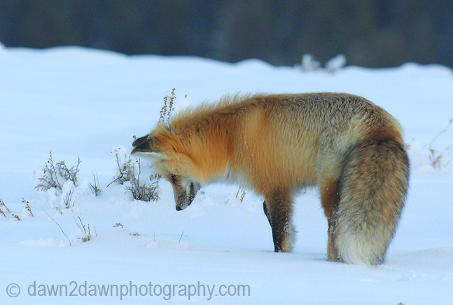 The red fox(Vulpes vulpes) is a mammal of the canid family (Others are wolves and coyotes) that leads a solitary life for the most part. Sounds like my life! Mostly nocturnal( Sounds like my life), they are rarely seen during the day at Yellowstone National Park except in the winter when I was able to get these shots. All of these images can be purchased as either prints or downloadable files at http://dawn2dawnphotography.com/