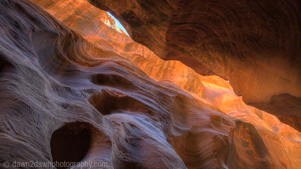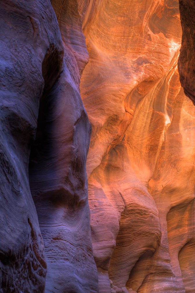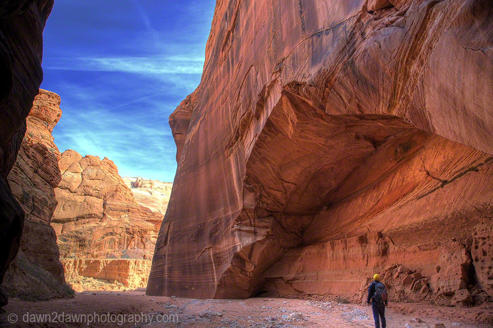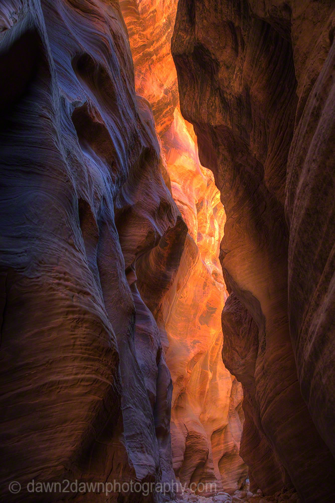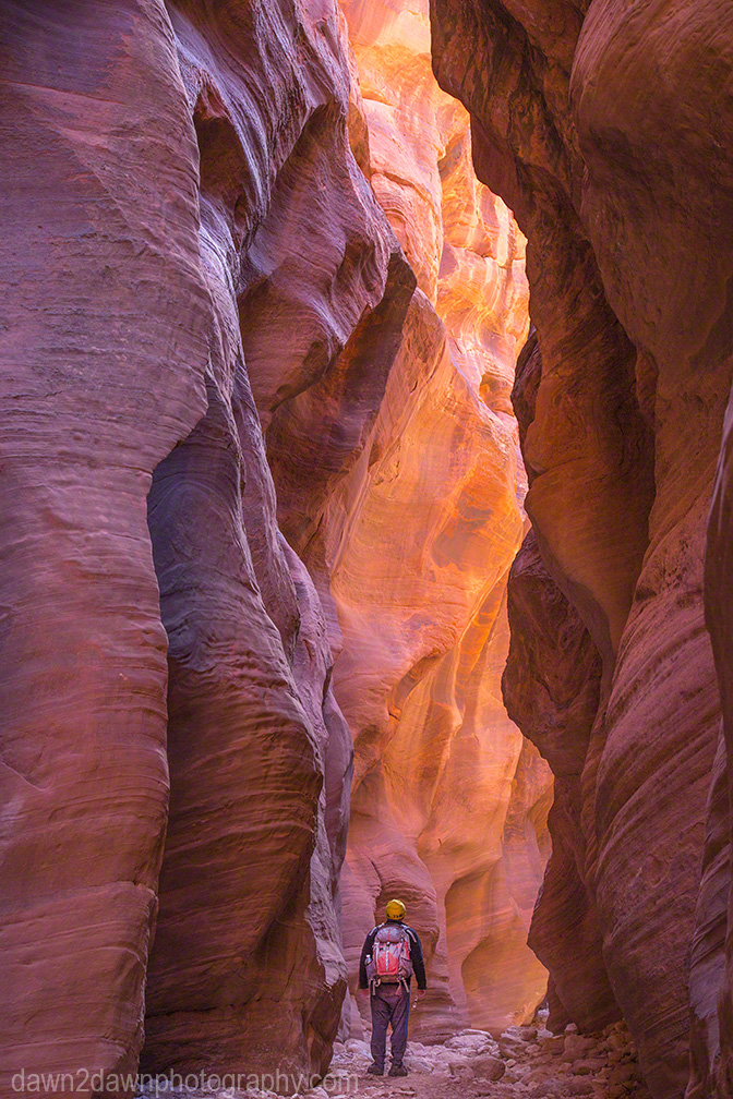 For those people(Like Me) who don’t get a permit for The Wave because a tour bus of people showed up at the lottery drawing, another option is to visit Buckskin Gulch. It is the longest slot canyon (13 miles)in the US and it is fun. On this particular day, my aim was to get to a spot in the canyon where the afternoon sun would be highest (not so high in winter) and capture the colorful and various hues it produces on the sandstone canyon walls. The indirect sunlight reflecting and bouncing back and forth on the walls generates magentas, oranges, tangerines, blues, cyans, reds, violets, golds and whatever rainbow color you can visualize. I got the color I wanted but it only lasted about 20 minutes as the shifting sun altered the light. You first have to navigate the very narrow Wire Pass to get to Buckskin but it is fun in itself. You can purchase these images as either prints or downloadable image files at http://dawn2dawnphotography.com/