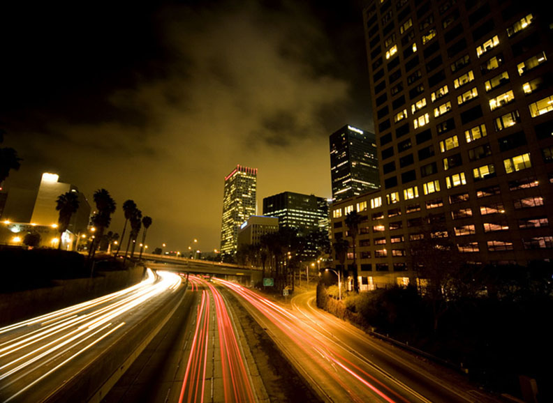 To get the effect of streaking car lights, you need a tripod and enough traffic to get a continuous line. This was shot in downtown Los Angeles just after the peak of rush hour where there was still plenty of traffic that was moving steadily. Bumper to bumper traffic (frequent in LA) would never give you this look unless you did a really long exposure. This was a 5 second exposure.