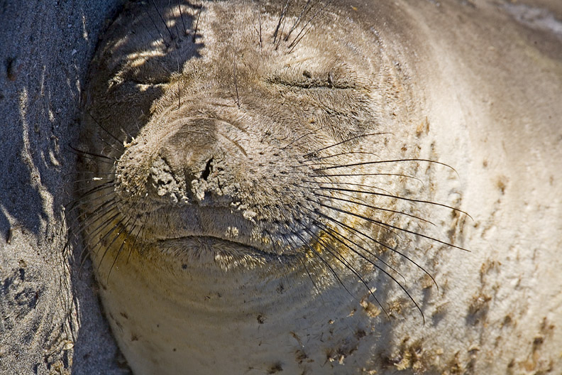 Elephant seals get their names because the males have snouts that resemble an elephant’s large proboscis.  Males grow to a size of approximately 2,500 pounds, so they take up a lot of room, like the one below.