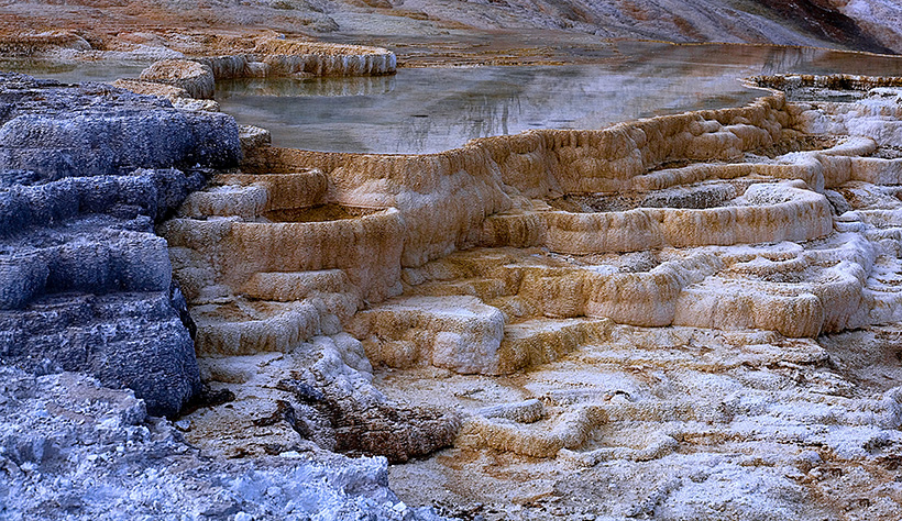 Grand Prismatic Spring, North America’s largest at 370 feet in diameter.Bright colors are produced by microorganisms called thermophiles living in the hot waters of Chromatic Spring.Castle Geyser steams on a cold morning.Old Faithful is still faithfulWhere else would you find these travertine terraces?Or these colors in nature.