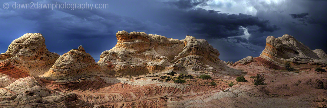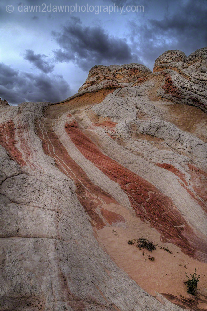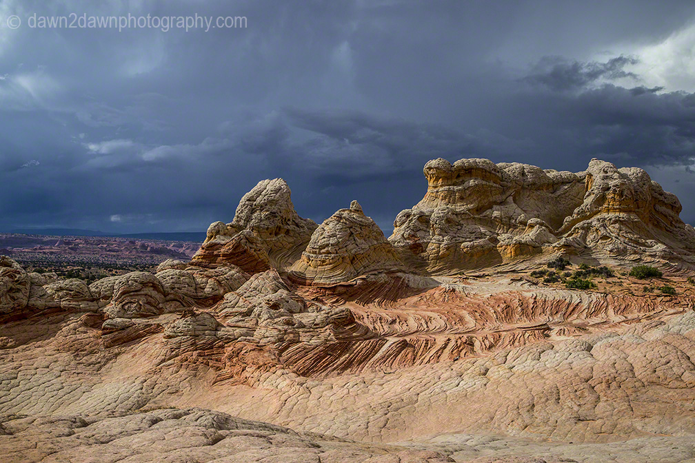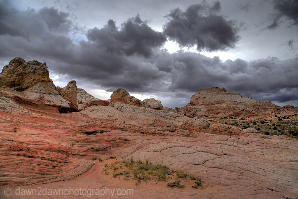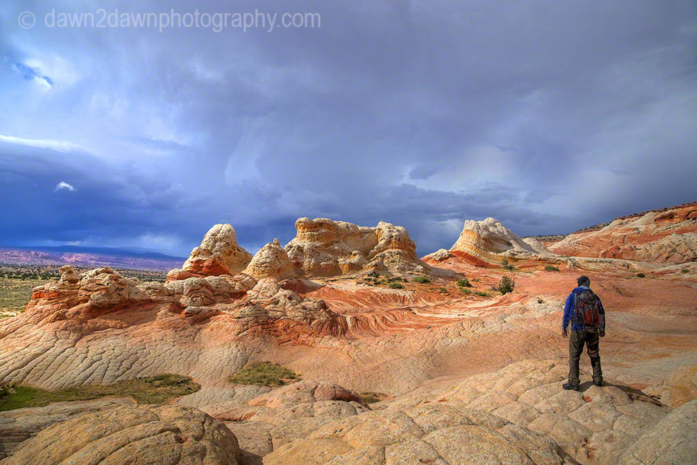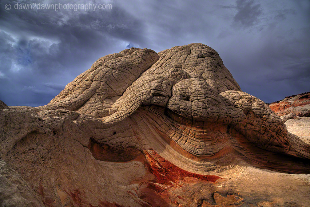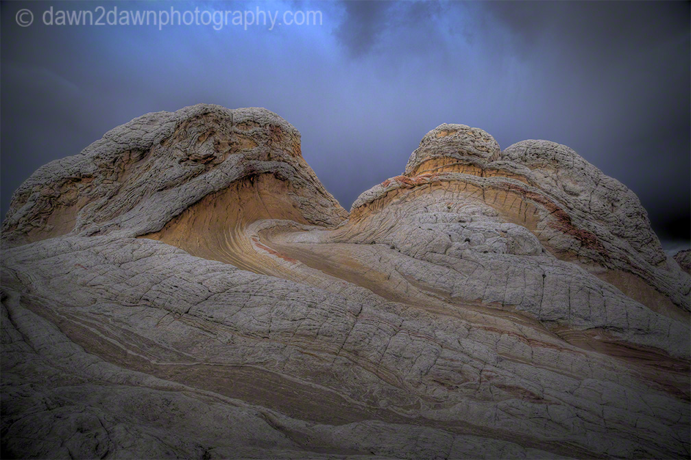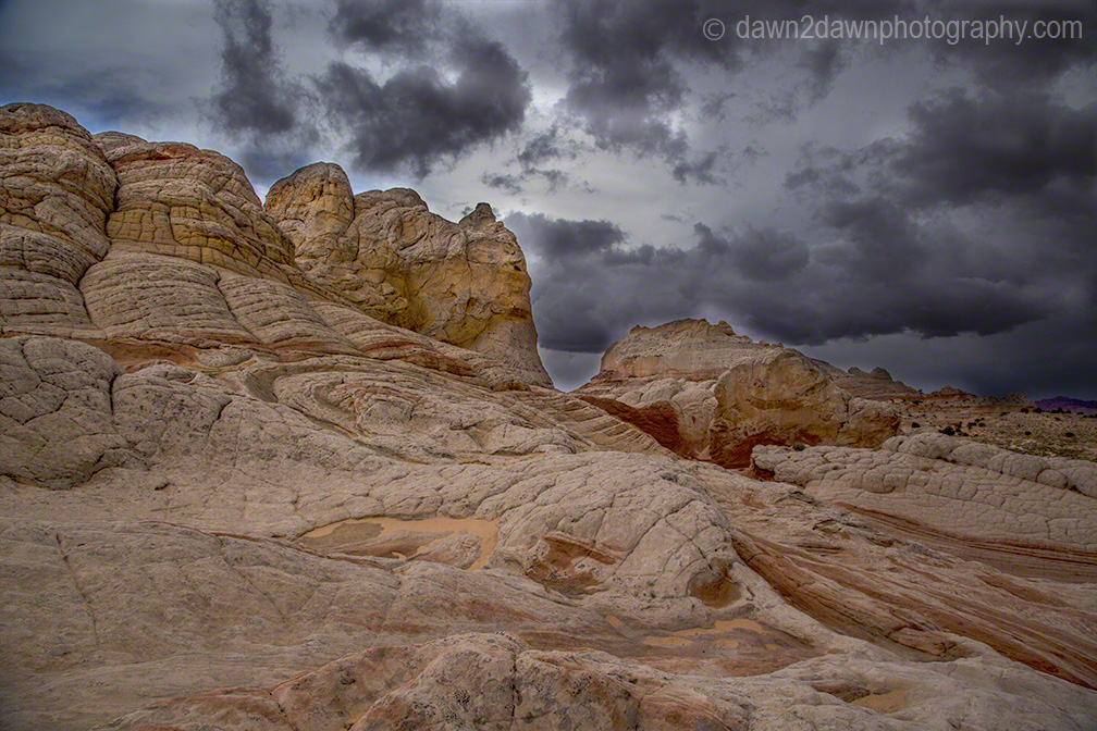 Last week I drove about 25 miles off of the nearest paved highway to reach White Pocket. Unlike the Coyote Buttes and The Wave, you don’t need a permit to visit White Pocket. You do need 4-wheel drive with good clearance, a good map and an ability to NOT run over the cows that graze on this BLM land. A rain storm passed through the area and these back country roads became a quagmire as my truck turned sideways going down a hill. You can see the companion time lapse video at http://wp.me/p1XNt4-tl.\