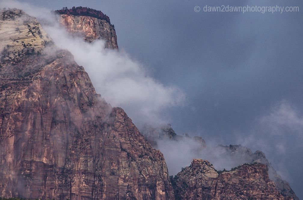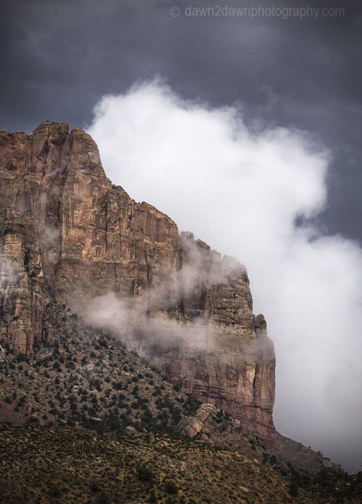 Passing storms bring rain and fog to the Eagle Crags just outside Zion National Park, Utah
