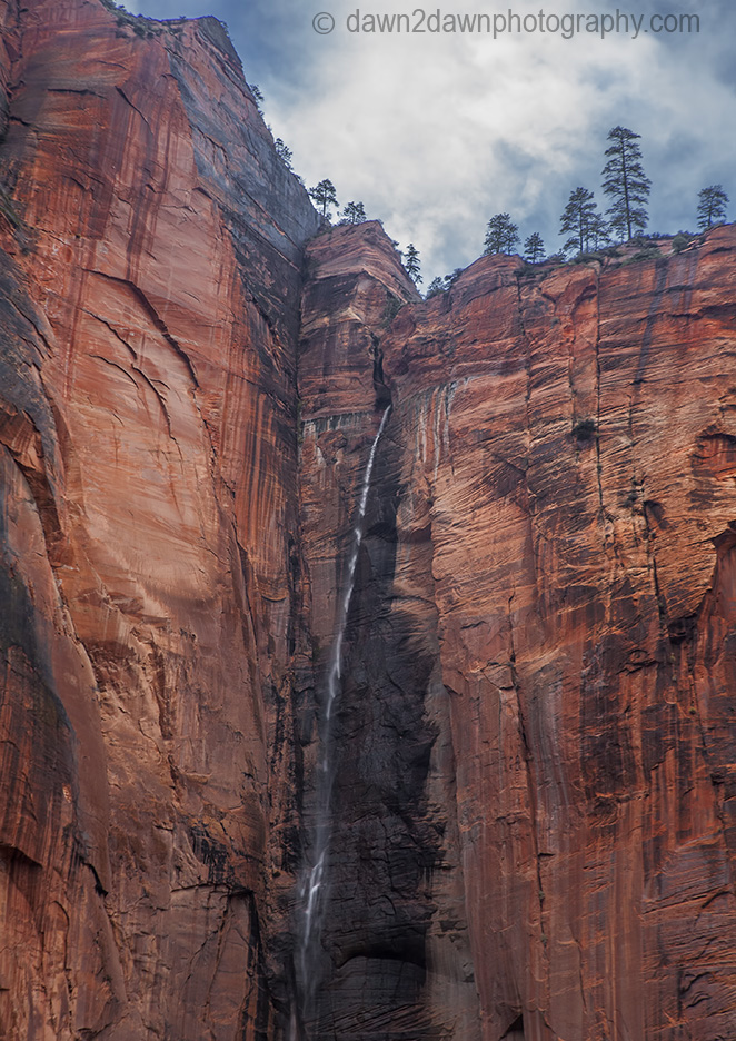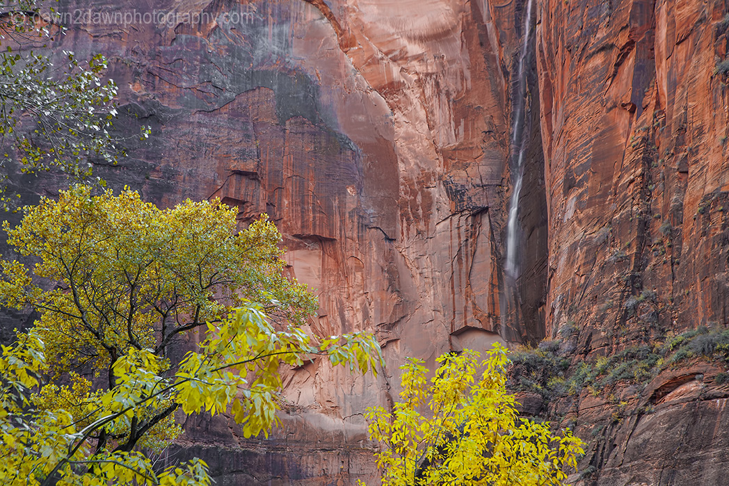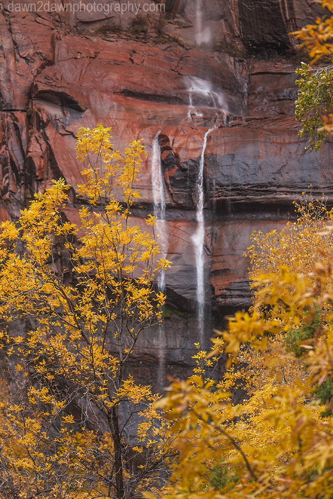 That is to photograph the elusive seasonal waterfalls at Zion National Park.  Visitors ask me where are the waterfalls.  I tell them, to their disappointment, that they only appear when it rains. Which it did earlier this week.  This was the only waterfall I spotted which combined with the fall colors in the park, presented some nice photo opportunities.