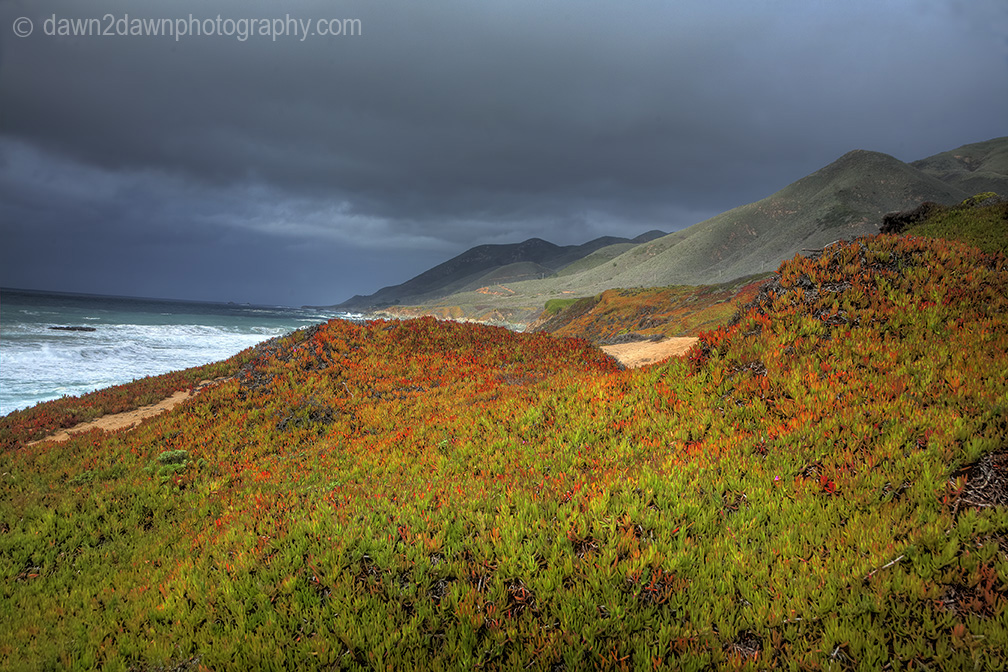 On my trip last week along California’s spectacular coastline, I noticed that the Ice Plant growing along the sand dunes and beaches was a very vibrant color. Fall weather had made its mark on the Ice Plant. In the second photo below, you’ll see the color of Ice Plant in other seasons. With an approaching Pacific Ocean storm, the contrast of the autumn colors to the dark blue skies was a refreshing look. Now, if we could only get an ocean in Southern Utah where I live.