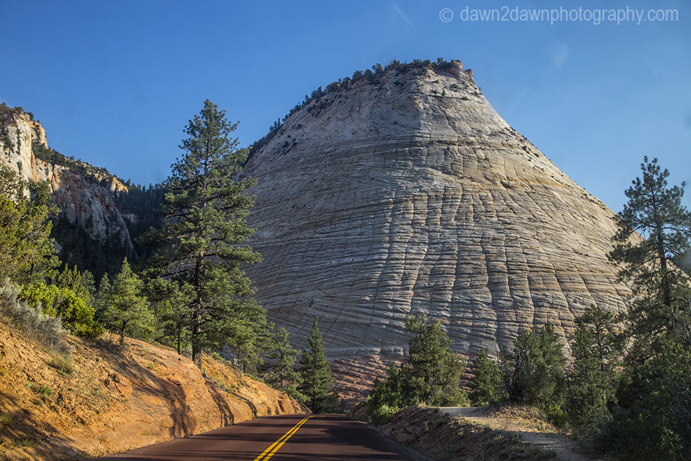 Produced from millions of years of erosion and cross bedding of the soft sandstone layers, Zion National Park’s Checkerboard Mesa is a natural geologic feature. One visitor to the park asked me if it was man made, probably because they couldn’t comprehend how nature could offer this. No stucco here!