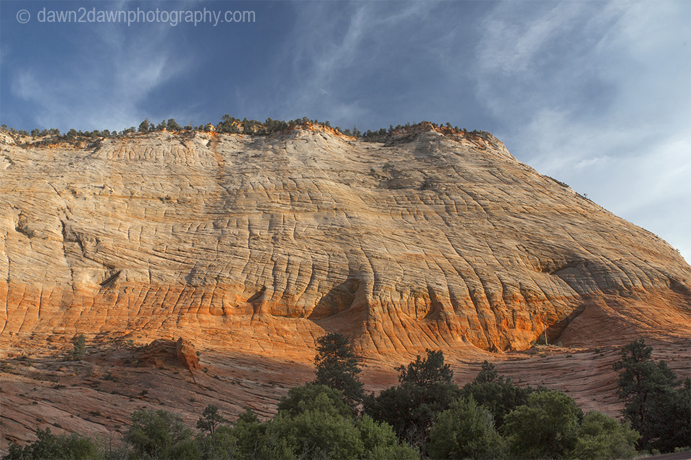 The light from the setting sun shines upon “Crazy Quilt Mesa” at Zion National Park, Utah