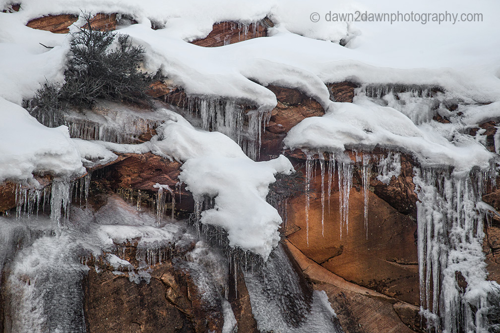Fresh snow and ice blanket Zion National Park in Southern Utah.