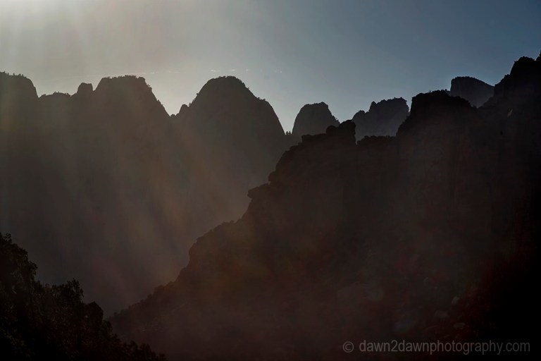 Rays from a setting sun accentuate the many ridge lines at Zion National Park, Utah