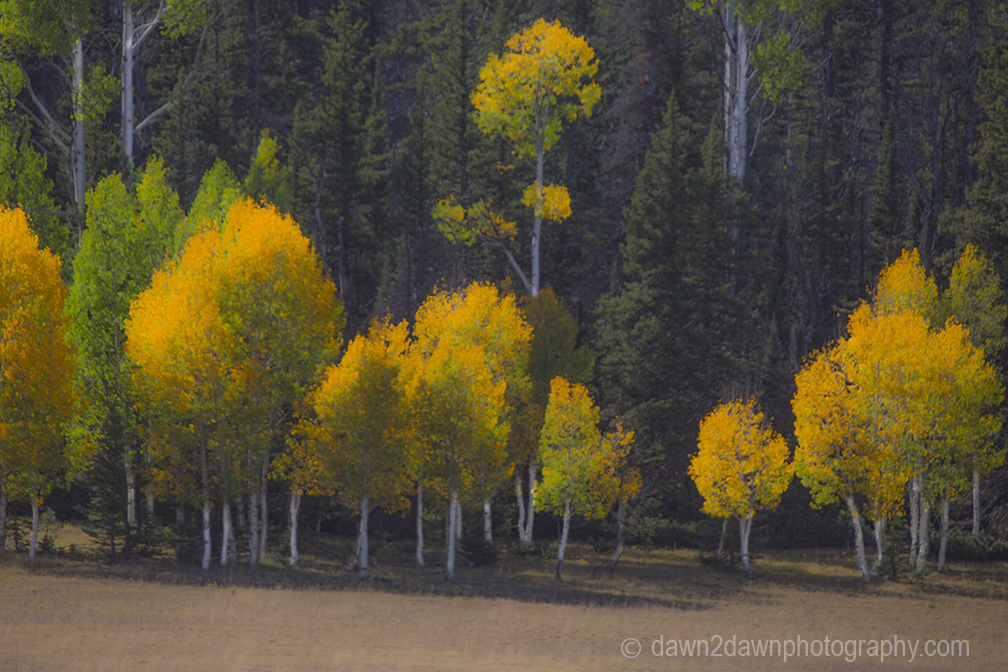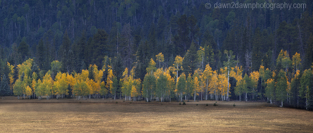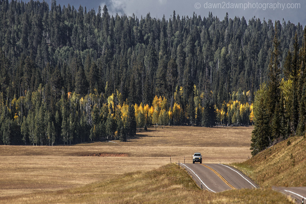 At the Kaibab National Forest, adjacent to Grand Canyon National Park’s North Rim.  At an elevation between eight to 9,000 feet, Autumn arrives early.  The Aspens were just beginning to change colors and should be at full color around the first of October. But small pockets couldn’t wait.