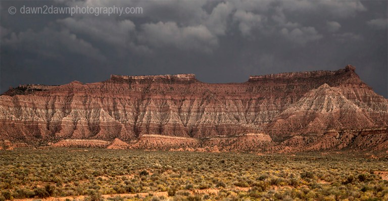 Storm clouds hover over Gooseberry Mesa in Southern Utah. The smaller hills at the base can be categorized as buttes.