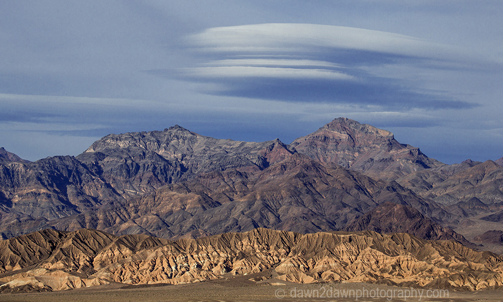 Per Wikipedia, Lenticular clouds (Altocumulus lenticularis in Latin) are stationary clouds that form in the troposphere, typically in perpendicular alignment to the wind direction. They are often comparable in appearance to a lens or saucer. This one I shot over Death Valley National Park last week. Kinda looks like a saucer. Area 51 is nearby.