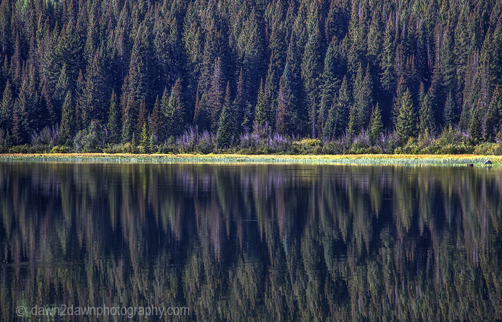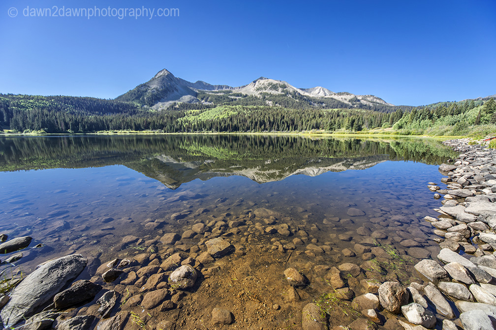The surrounding forest and mountains are reflected in the still Lost Lake in Colorado