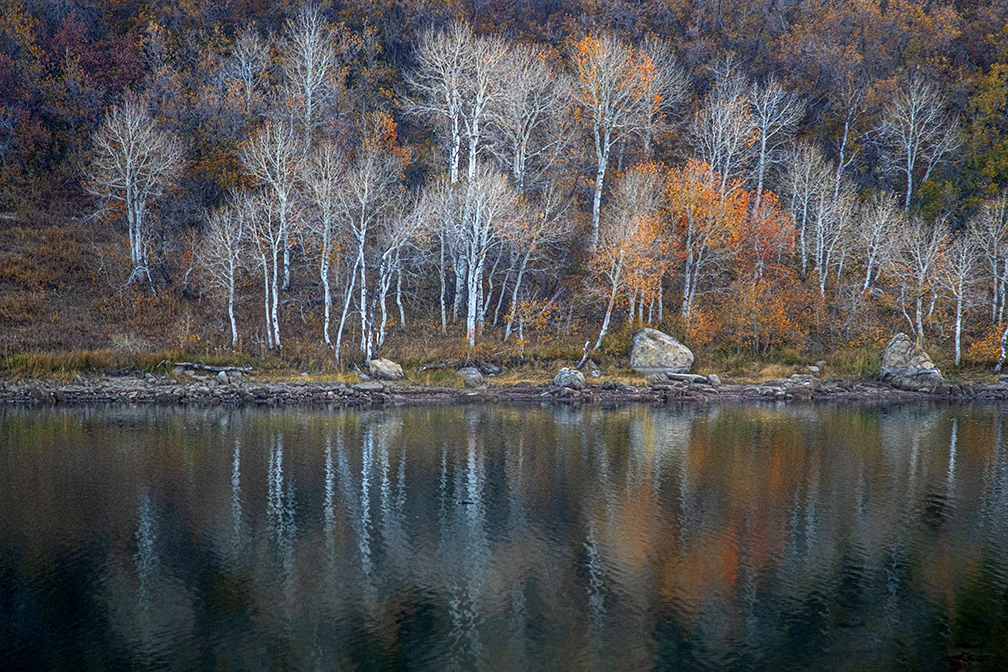 Fall colors are reflected in the calm waters of Kolob Reservoir in Southern Utah