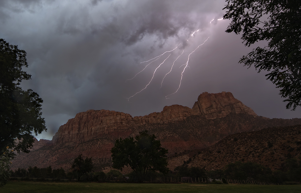 Lightning strikes above The Watchman at Zion National Park, Utah