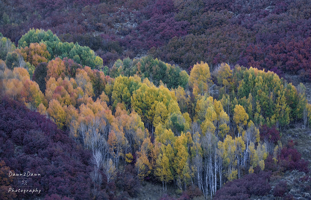 Fall colors have arrived in the Colorado highlands of Gunnison National Forest.The scrub oak also produces high color.