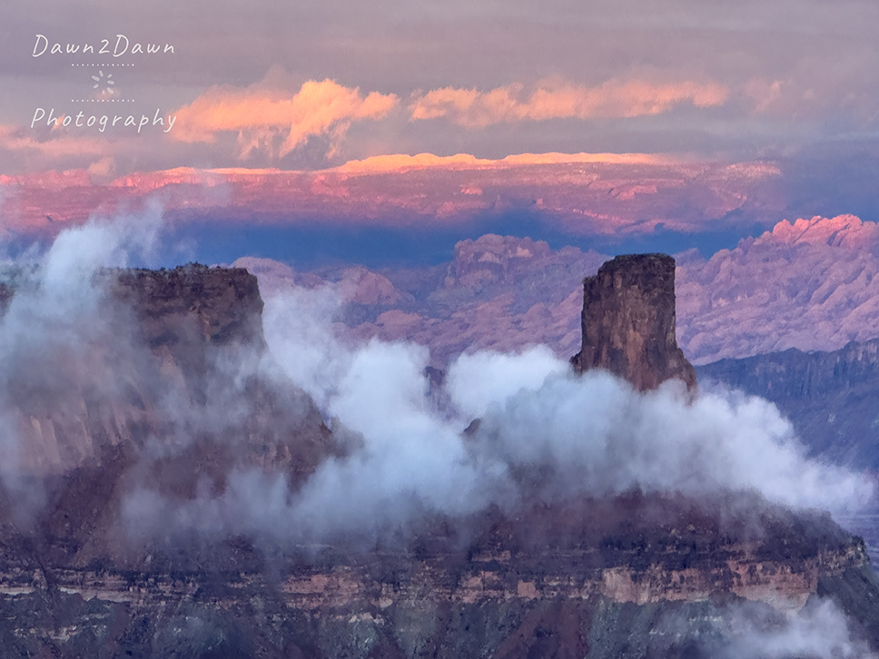 A passing rainstorm leaves residual clouds and fog as the sun penetrates the red rock landscape at Dead Horse Point State Park, Utah