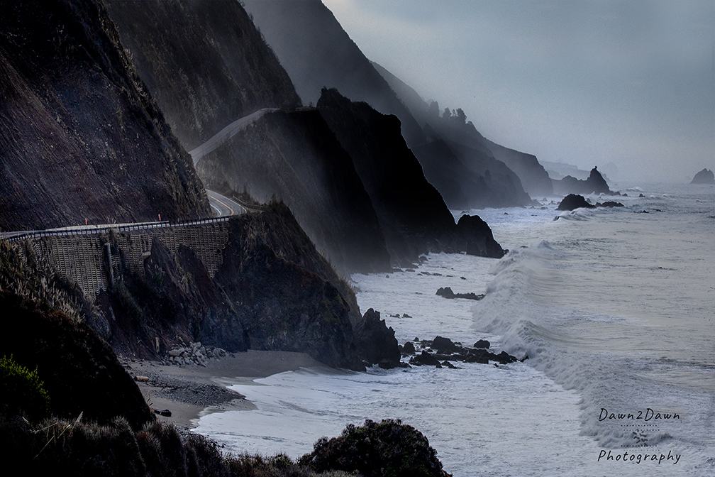 Powerful waves crash upon the beach along Pacific Coast Highway at the Pacific Ocean at Big Sur, California.