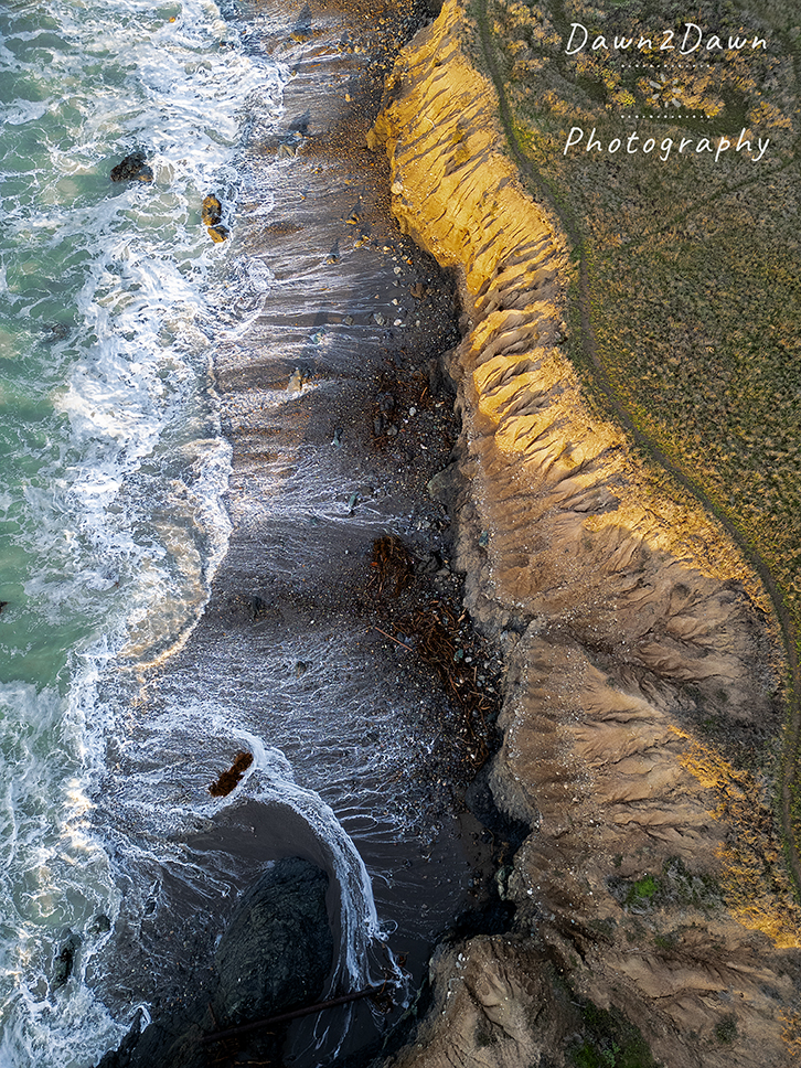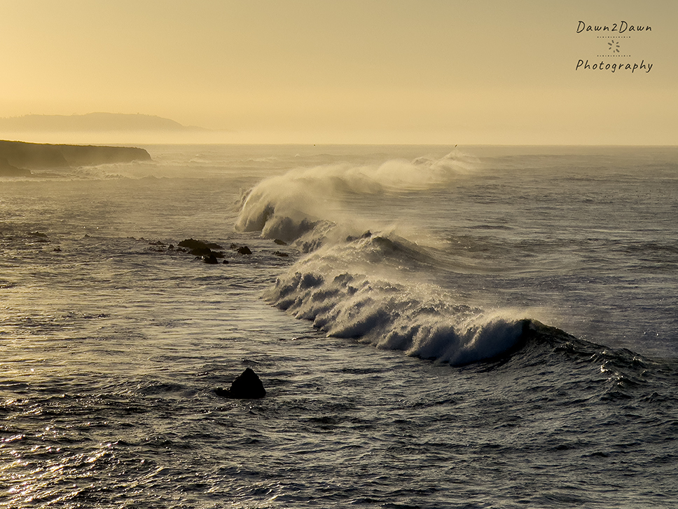Powerful waves crash upon the beach along the Pacific Ocean at San Simeon, California